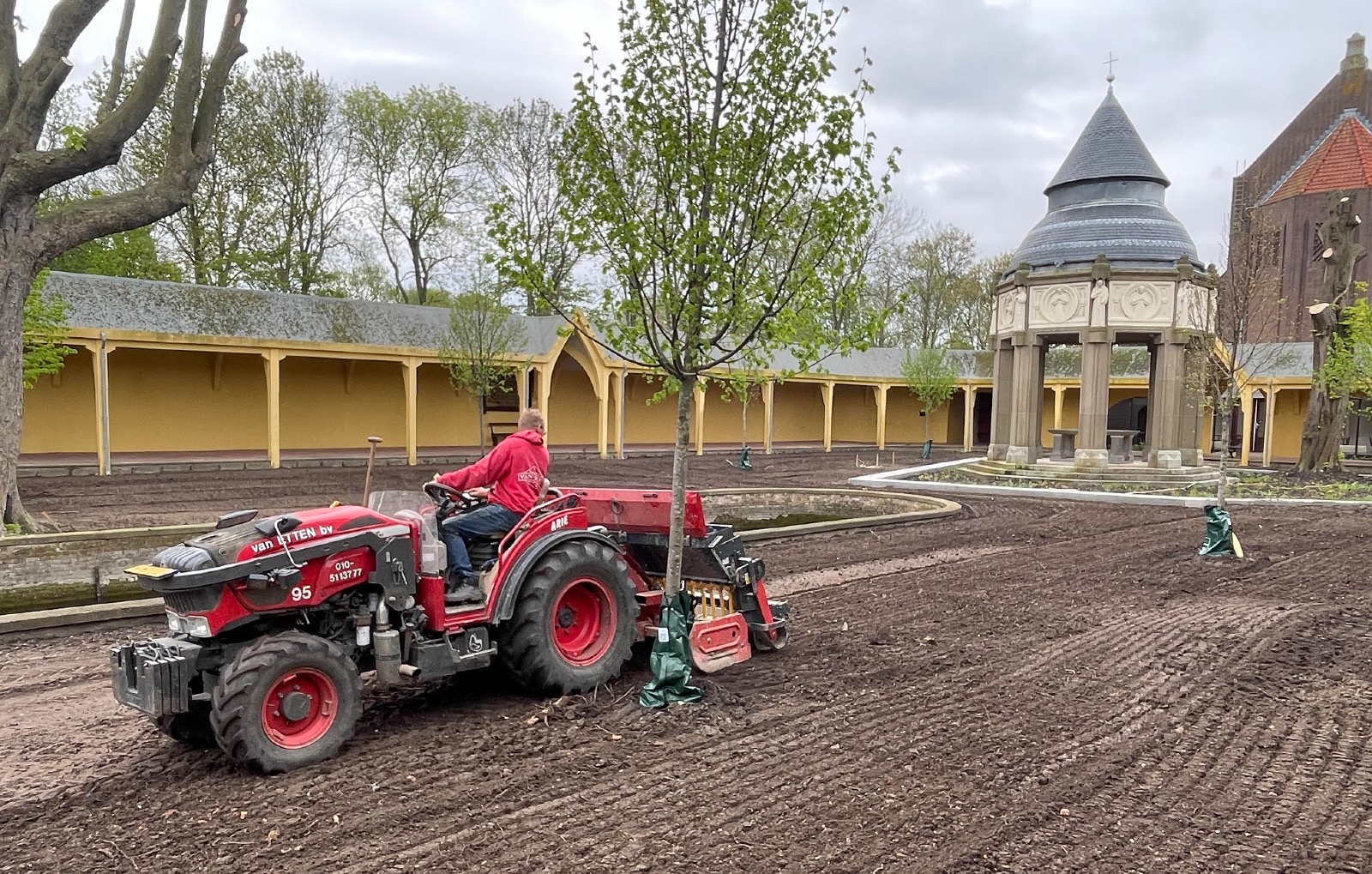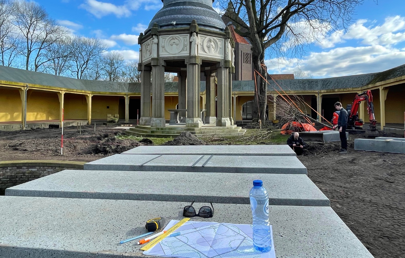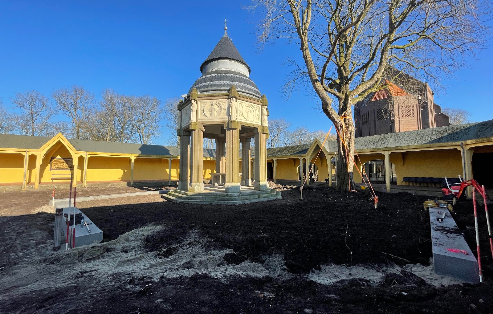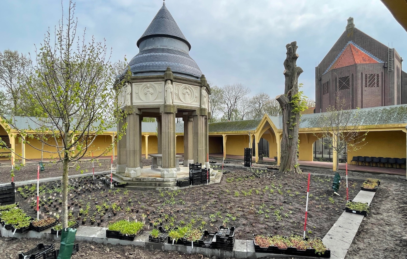 In de overige delen van het binnenterrein is de bodem verbeterd, nieuw gras ingezaaid, zijn bomen aangeplant en bloemstroken aangelegd om het groen en de biodiversiteit te versterken. Ook buiten het binnenterrein hebben we nieuwe bomen geplant en herdenkingspalen geplaatst, waardoor het geheel niet alleen een groene, maar ook een waardige en betekenisvolle herinrichting heeft gekregen.
