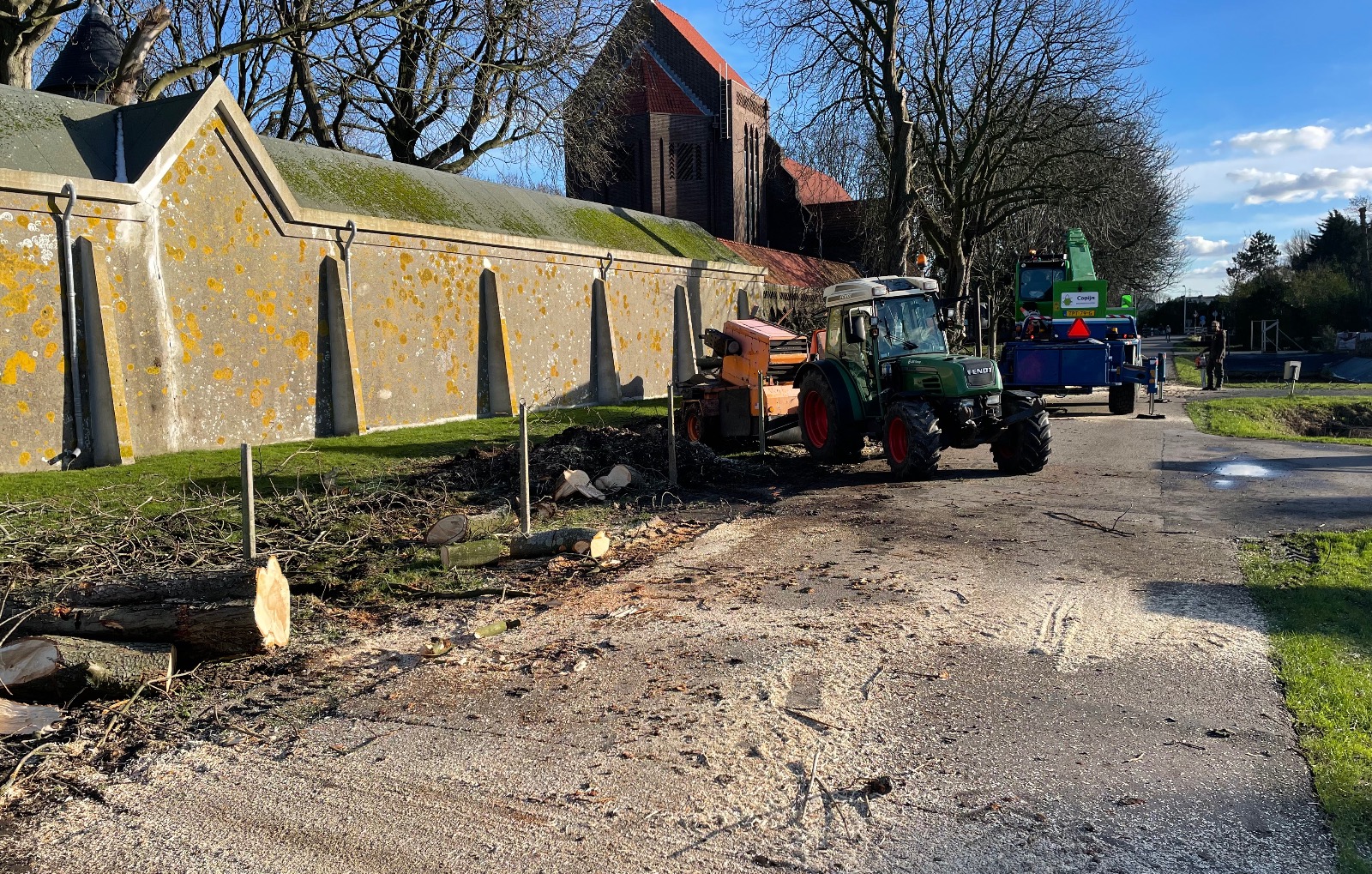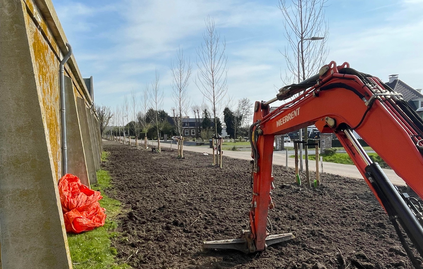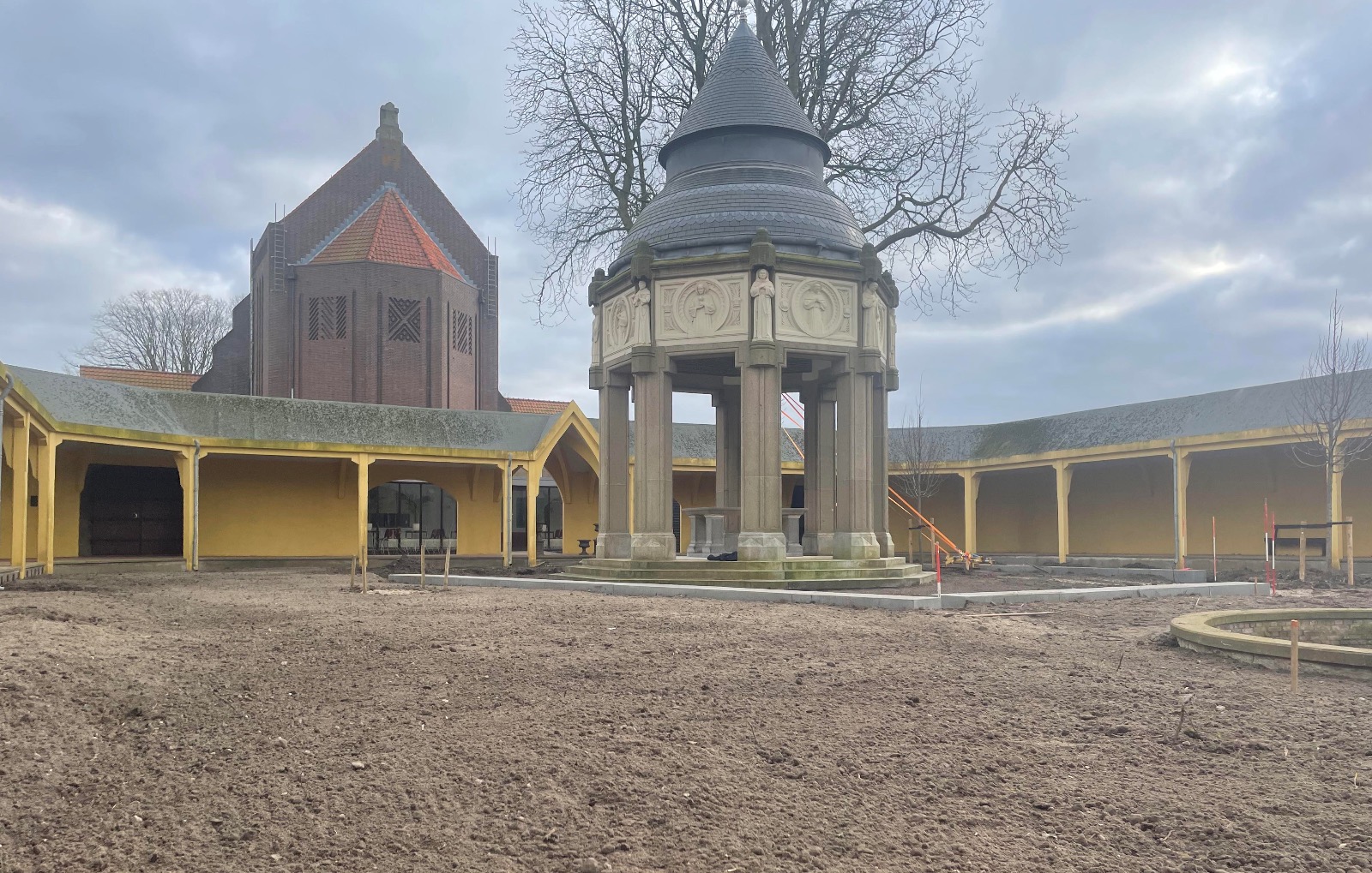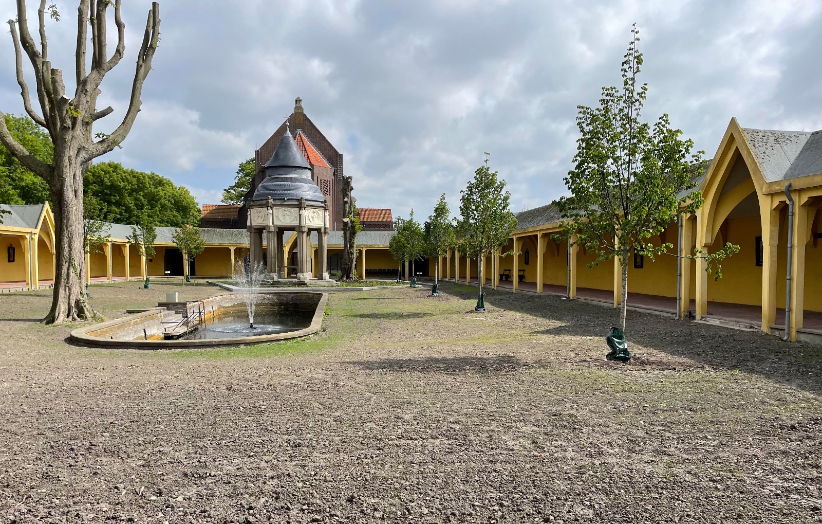 In de overige delen van het binnenterrein is de bodem verbeterd, nieuw gras ingezaaid, zijn bomen aangeplant en bloemstroken aangelegd om het groen en de biodiversiteit te versterken. Ook buiten het binnenterrein hebben we nieuwe bomen geplant en herdenkingspalen geplaatst, waardoor het geheel niet alleen een groene, maar ook een waardige en betekenisvolle herinrichting heeft gekregen.